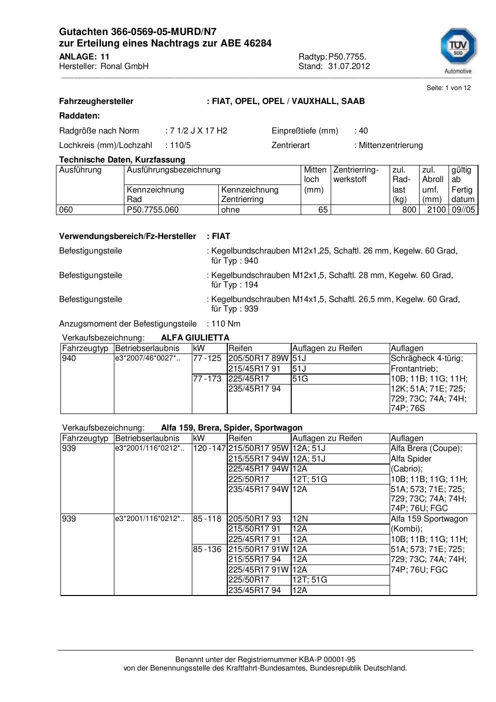 Dieses Gutachten (abe) bezieht sich auf die Alufelge Ronal P50.7755 in der Ausführung 2Jx17 ET 0, Mittenloch 0 mm (KBA 46284). Im PDF findest du typischerweise zulässige Reifengrößen, Auflagen/Anbauhinweise und – je nach Dokument – Hinweise zur Eintragung.