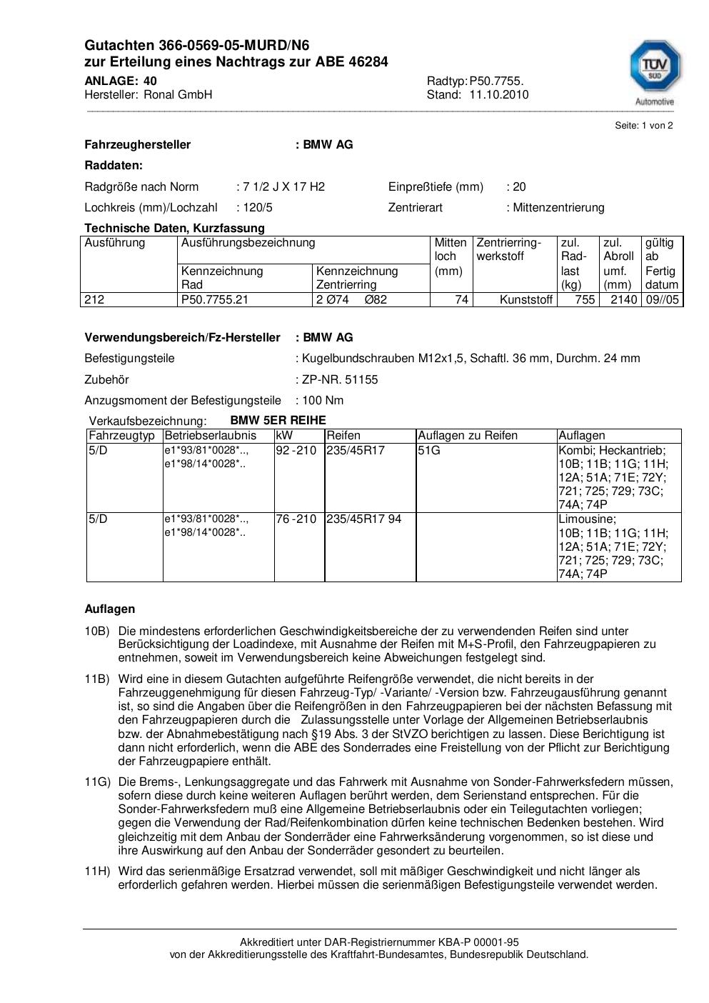 Dieses Gutachten (abe) bezieht sich auf die Alufelge Ronal P50.7755 in der Ausführung 2Jx17 ET 0, Mittenloch 0 mm (KBA 46284). Im PDF findest du typischerweise zulässige Reifengrößen, Auflagen/Anbauhinweise und – je nach Dokument – Hinweise zur Eintragung.