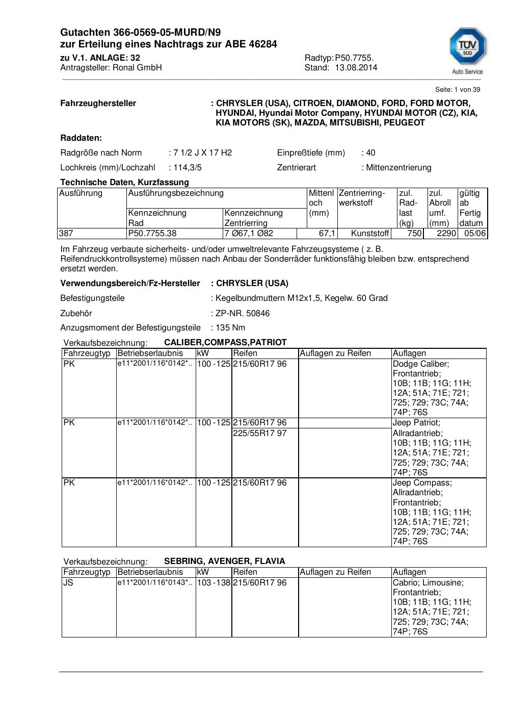 Dieses Gutachten (abe) bezieht sich auf die Alufelge Ronal P50.7755 in der Ausführung 2Jx17 ET 0, Mittenloch 0 mm (KBA 46284). Im PDF findest du typischerweise zulässige Reifengrößen, Auflagen/Anbauhinweise und – je nach Dokument – Hinweise zur Eintragung.