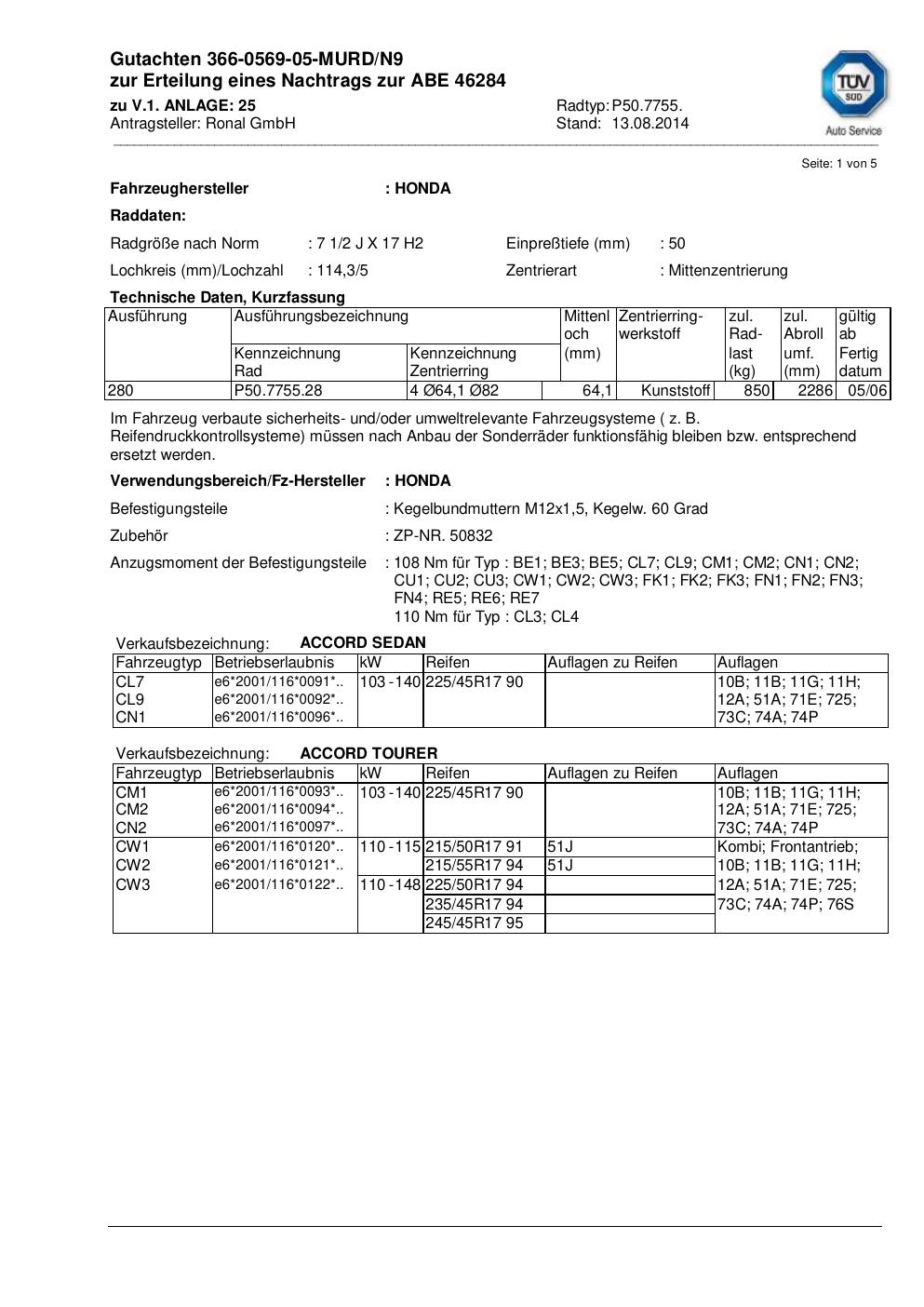 Dieses Gutachten (abe) bezieht sich auf die Alufelge Ronal P50.7755 in der Ausführung 2Jx17 ET 0, Mittenloch 0 mm (KBA 46284). Im PDF findest du typischerweise zulässige Reifengrößen, Auflagen/Anbauhinweise und – je nach Dokument – Hinweise zur Eintragung.