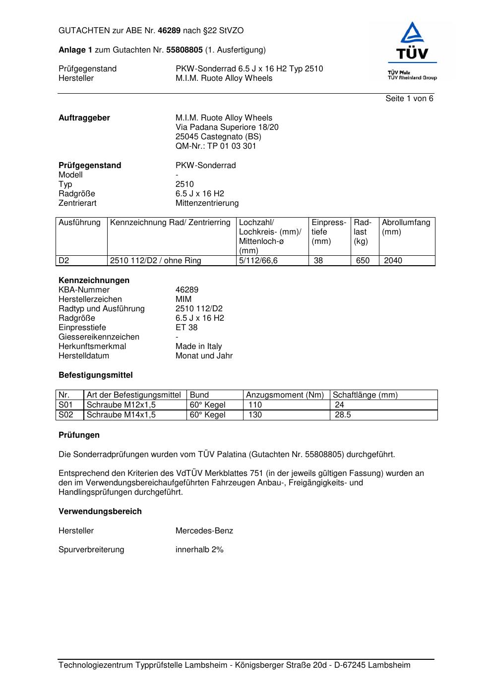 Dieses Gutachten (abe) bezieht sich auf die Alufelge ATS 2510 in der Ausführung 6.5Jx16 ET 0, Mittenloch 0 mm (KBA 46289). Im PDF findest du typischerweise zulässige Reifengrößen, Auflagen/Anbauhinweise und – je nach Dokument – Hinweise zur Eintragung.