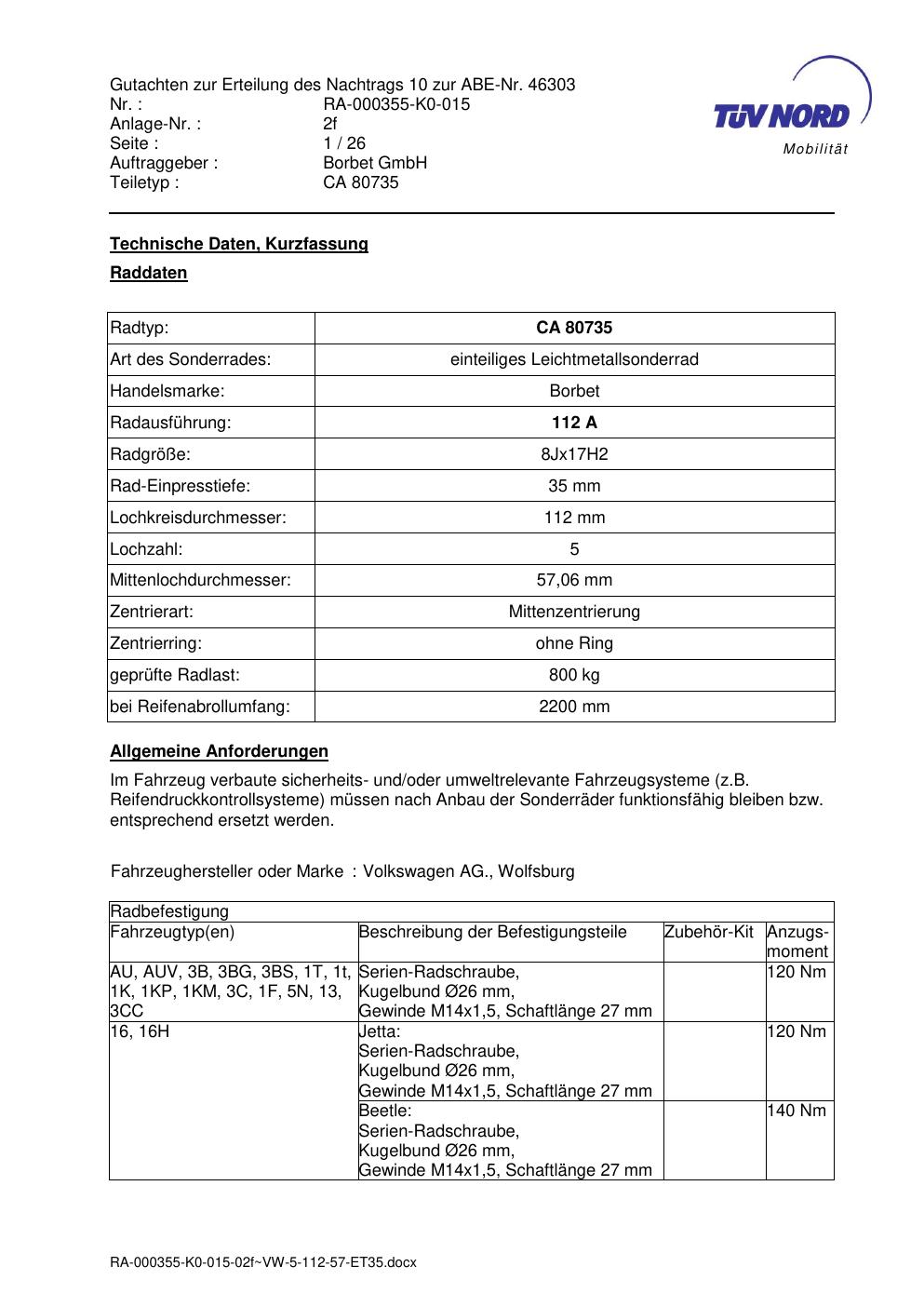 Dieses Gutachten (abe) bezieht sich auf die Alufelge brand-borbet CA 80735 in der Ausführung 8Jx17 ET 0, Mittenloch 0 mm (KBA 46303). Im PDF findest du typischerweise zulässige Reifengrößen, Auflagen/Anbauhinweise und – je nach Dokument – Hinweise zur Eintragung.
