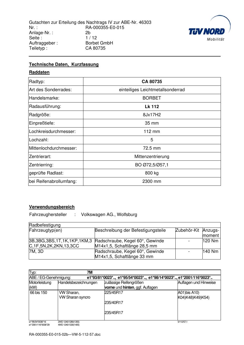 Dieses Gutachten (abe) bezieht sich auf die Alufelge brand-borbet CA 80735 in der Ausführung 8Jx17 ET 0, Mittenloch 0 mm (KBA 46303). Im PDF findest du typischerweise zulässige Reifengrößen, Auflagen/Anbauhinweise und – je nach Dokument – Hinweise zur Eintragung.
