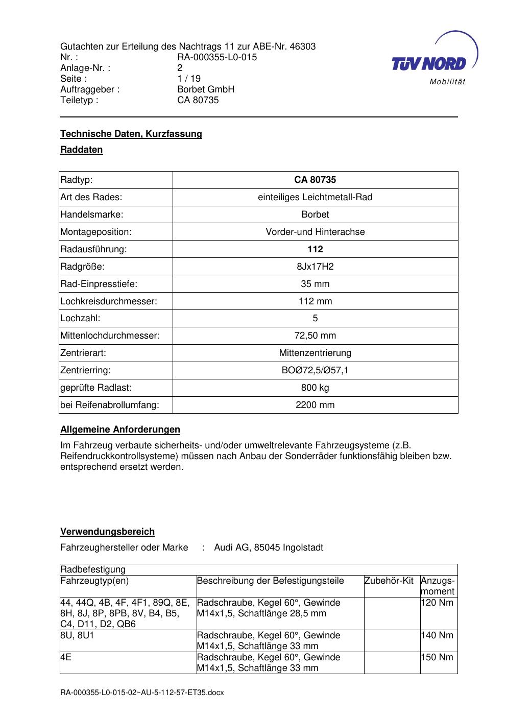 Dieses Gutachten (abe) bezieht sich auf die Alufelge brand-borbet CA 80735 in der Ausführung 8Jx17 ET 0, Mittenloch 0 mm (KBA 46303). Im PDF findest du typischerweise zulässige Reifengrößen, Auflagen/Anbauhinweise und – je nach Dokument – Hinweise zur Eintragung.