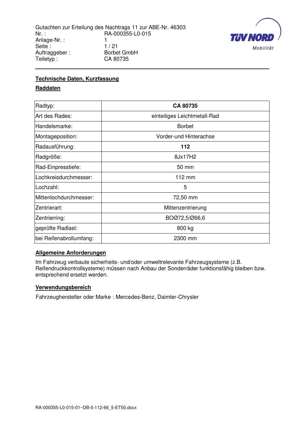 Dieses Gutachten (abe) bezieht sich auf die Alufelge brand-borbet CA 80735 in der Ausführung 8Jx17 ET 0, Mittenloch 0 mm (KBA 46303). Im PDF findest du typischerweise zulässige Reifengrößen, Auflagen/Anbauhinweise und – je nach Dokument – Hinweise zur Eintragung.