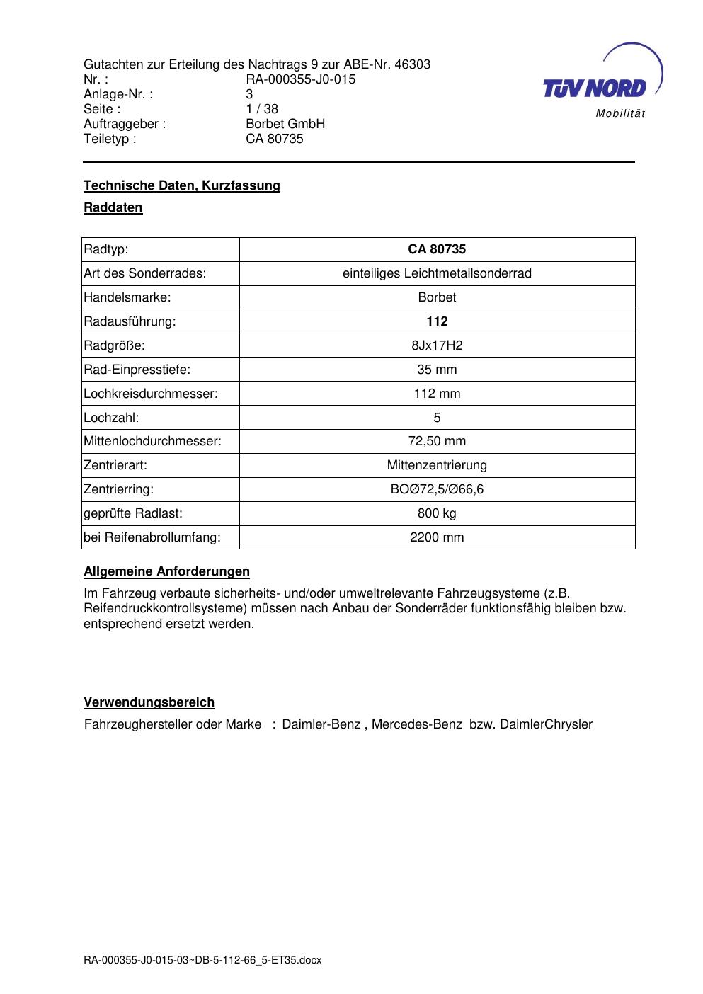 Dieses Gutachten (abe) bezieht sich auf die Alufelge brand-borbet CA 80735 in der Ausführung 8Jx17 ET 0, Mittenloch 0 mm (KBA 46303). Im PDF findest du typischerweise zulässige Reifengrößen, Auflagen/Anbauhinweise und – je nach Dokument – Hinweise zur Eintragung.