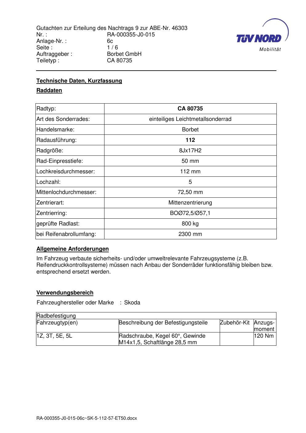 Dieses Gutachten (abe) bezieht sich auf die Alufelge Borbet CA 80735 in der Ausführung 8Jx17 ET 0, Mittenloch 0 mm (KBA 46303). Im PDF findest du typischerweise zulässige Reifengrößen, Auflagen/Anbauhinweise und – je nach Dokument – Hinweise zur Eintragung.