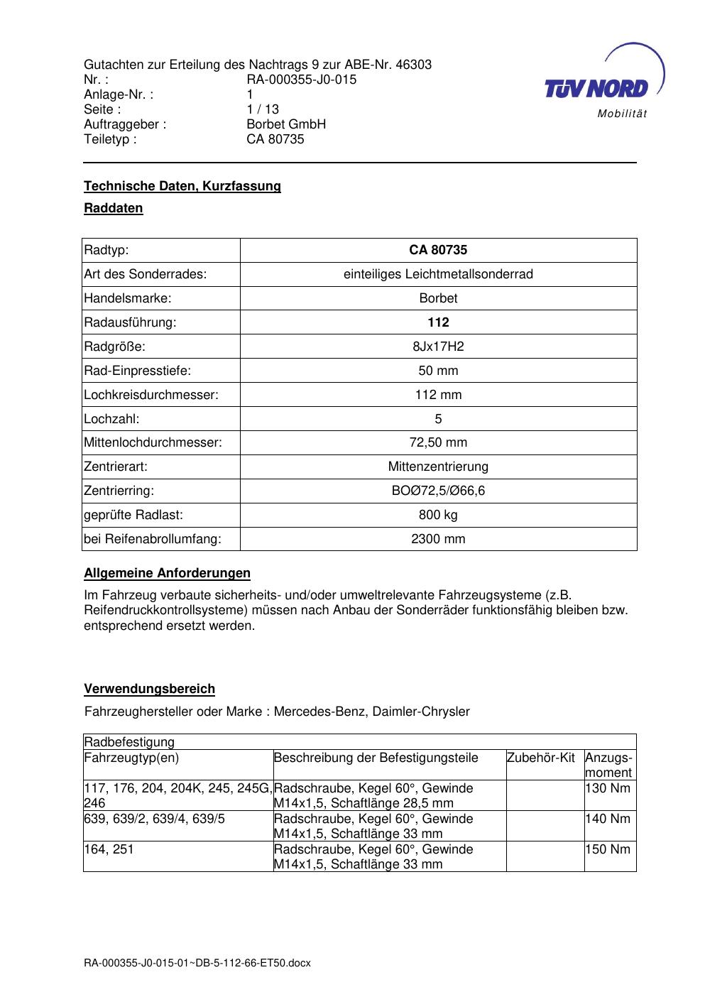 Dieses Gutachten (abe) bezieht sich auf die Alufelge brand-borbet CA 80735 in der Ausführung 8Jx17 ET 0, Mittenloch 0 mm (KBA 46303). Im PDF findest du typischerweise zulässige Reifengrößen, Auflagen/Anbauhinweise und – je nach Dokument – Hinweise zur Eintragung.