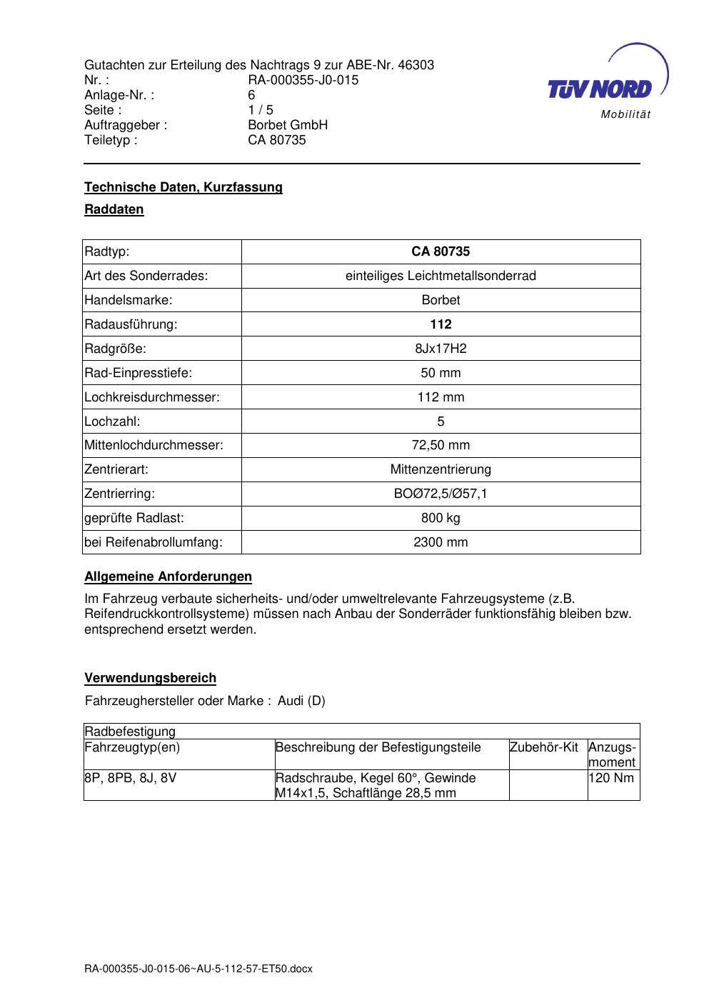 Dieses Gutachten (abe) bezieht sich auf die Alufelge brand-borbet CA 80735 in der Ausführung 8Jx17 ET 0, Mittenloch 0 mm (KBA 46303). Im PDF findest du typischerweise zulässige Reifengrößen, Auflagen/Anbauhinweise und – je nach Dokument – Hinweise zur Eintragung.