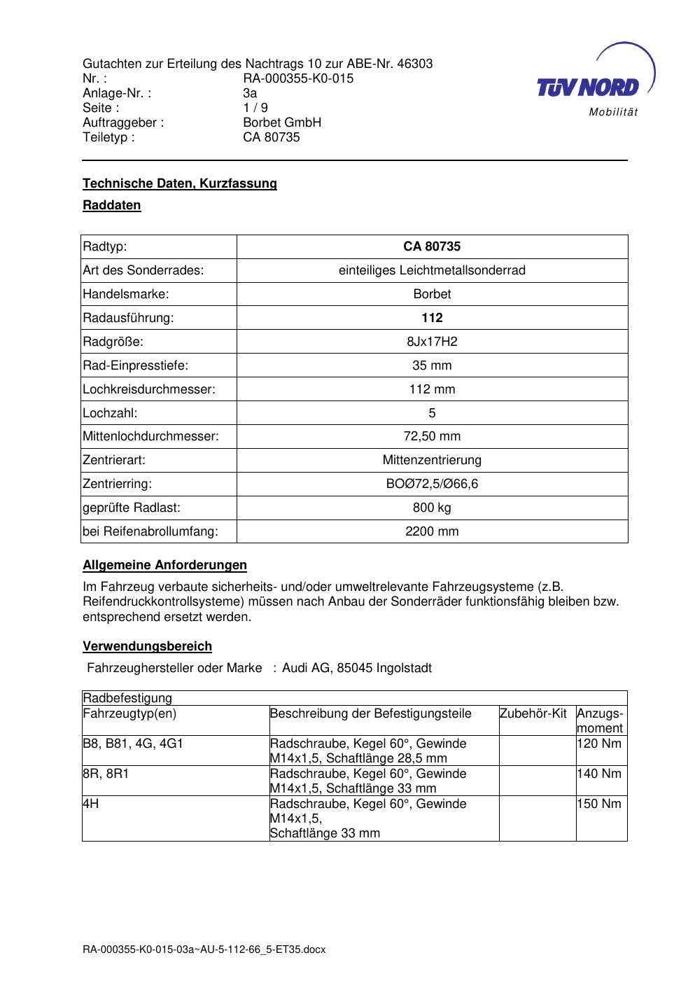Dieses Gutachten (abe) bezieht sich auf die Alufelge brand-borbet CA 80735 in der Ausführung 8Jx17 ET 0, Mittenloch 0 mm (KBA 46303). Im PDF findest du typischerweise zulässige Reifengrößen, Auflagen/Anbauhinweise und – je nach Dokument – Hinweise zur Eintragung.