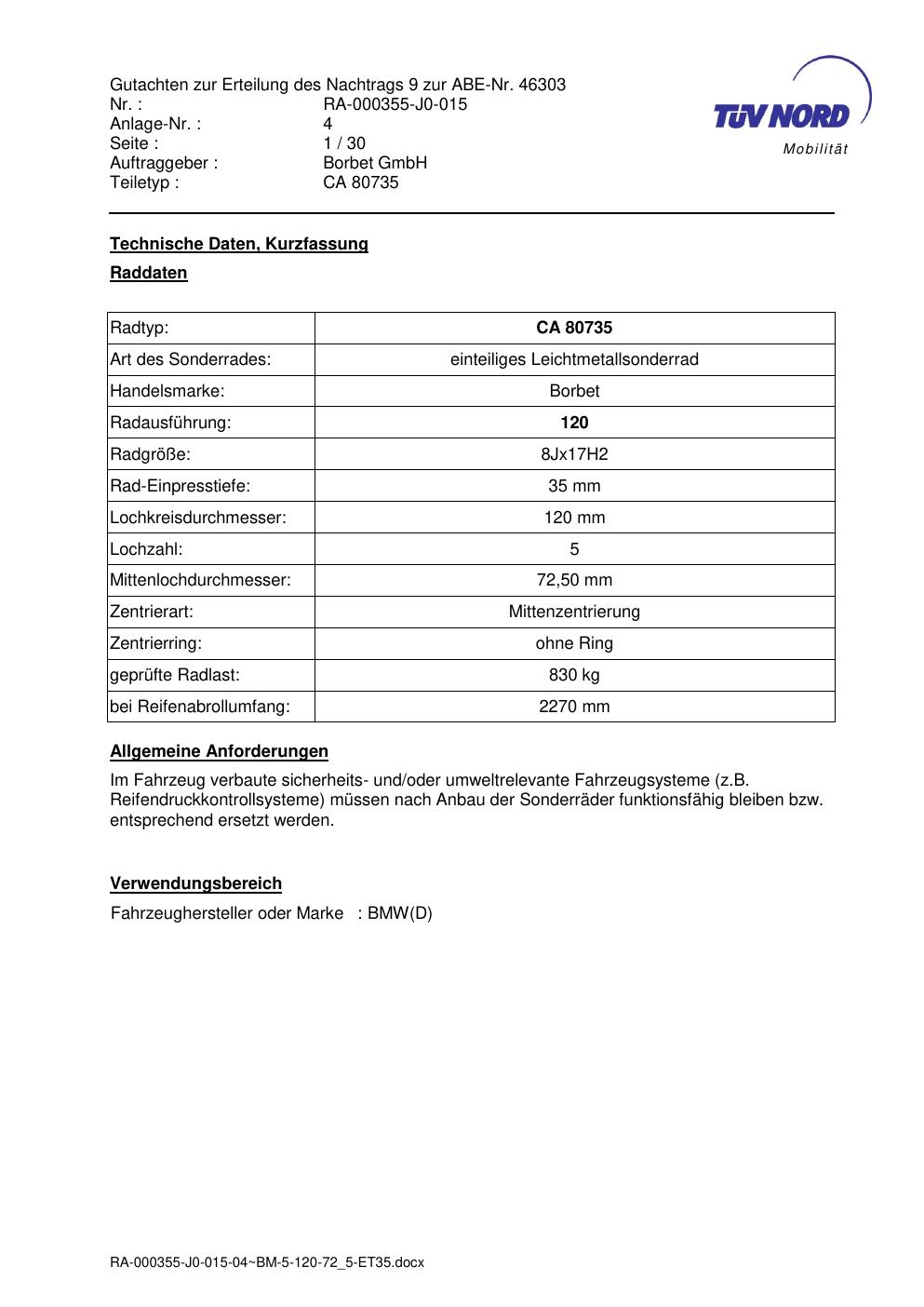 Dieses Gutachten (abe) bezieht sich auf die Alufelge brand-borbet CA 80735 in der Ausführung 8Jx17 ET 0, Mittenloch 0 mm (KBA 46303). Im PDF findest du typischerweise zulässige Reifengrößen, Auflagen/Anbauhinweise und – je nach Dokument – Hinweise zur Eintragung.