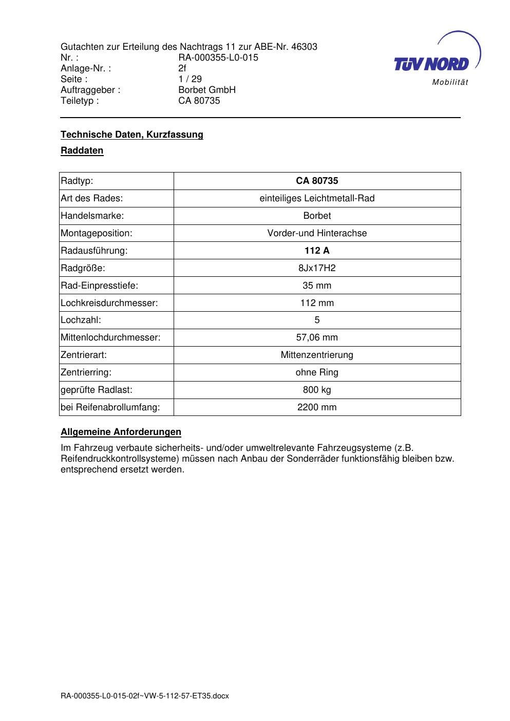 Dieses Gutachten (abe) bezieht sich auf die Alufelge brand-borbet CA 80735 in der Ausführung 8Jx17 ET 0, Mittenloch 0 mm (KBA 46303). Im PDF findest du typischerweise zulässige Reifengrößen, Auflagen/Anbauhinweise und – je nach Dokument – Hinweise zur Eintragung.