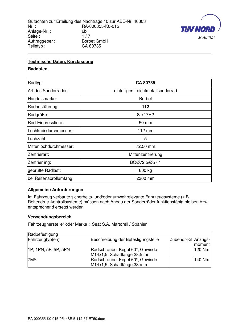 Dieses Gutachten (abe) bezieht sich auf die Alufelge brand-borbet CA 80735 in der Ausführung 8Jx17 ET 0, Mittenloch 0 mm (KBA 46303). Im PDF findest du typischerweise zulässige Reifengrößen, Auflagen/Anbauhinweise und – je nach Dokument – Hinweise zur Eintragung.