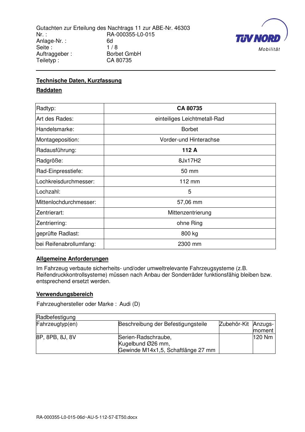 Dieses Gutachten (abe) bezieht sich auf die Alufelge brand-borbet CA 80735 in der Ausführung 8Jx17 ET 0, Mittenloch 0 mm (KBA 46303). Im PDF findest du typischerweise zulässige Reifengrößen, Auflagen/Anbauhinweise und – je nach Dokument – Hinweise zur Eintragung.