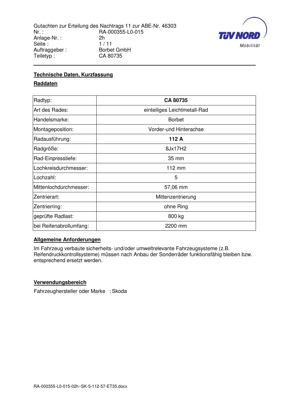 Dieses Gutachten (abe) bezieht sich auf die Alufelge brand-borbet CA 80735 in der Ausführung 8Jx17 ET 0, Mittenloch 0 mm (KBA 46303). Im PDF findest du typischerweise zulässige Reifengrößen, Auflagen/Anbauhinweise und – je nach Dokument – Hinweise zur Eintragung.