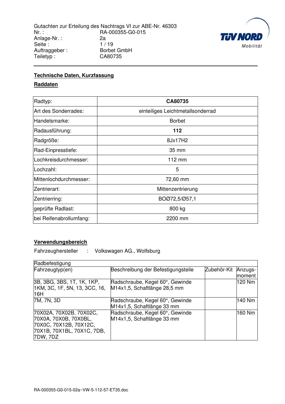 Dieses Gutachten (abe) bezieht sich auf die Alufelge brand-borbet CA80735 in der Ausführung 8Jx17 ET 0, Mittenloch 0 mm (KBA 46303). Im PDF findest du typischerweise zulässige Reifengrößen, Auflagen/Anbauhinweise und – je nach Dokument – Hinweise zur Eintragung.
