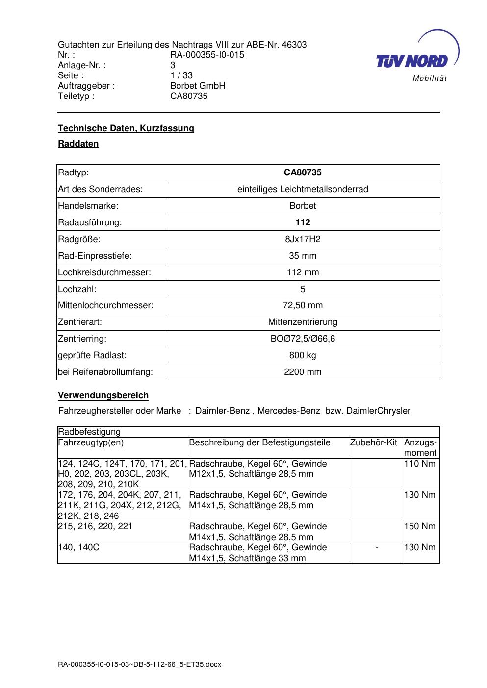 Dieses Gutachten (abe) bezieht sich auf die Alufelge brand-borbet CA80735 in der Ausführung 8Jx17 ET 0, Mittenloch 0 mm (KBA 46303). Im PDF findest du typischerweise zulässige Reifengrößen, Auflagen/Anbauhinweise und – je nach Dokument – Hinweise zur Eintragung.