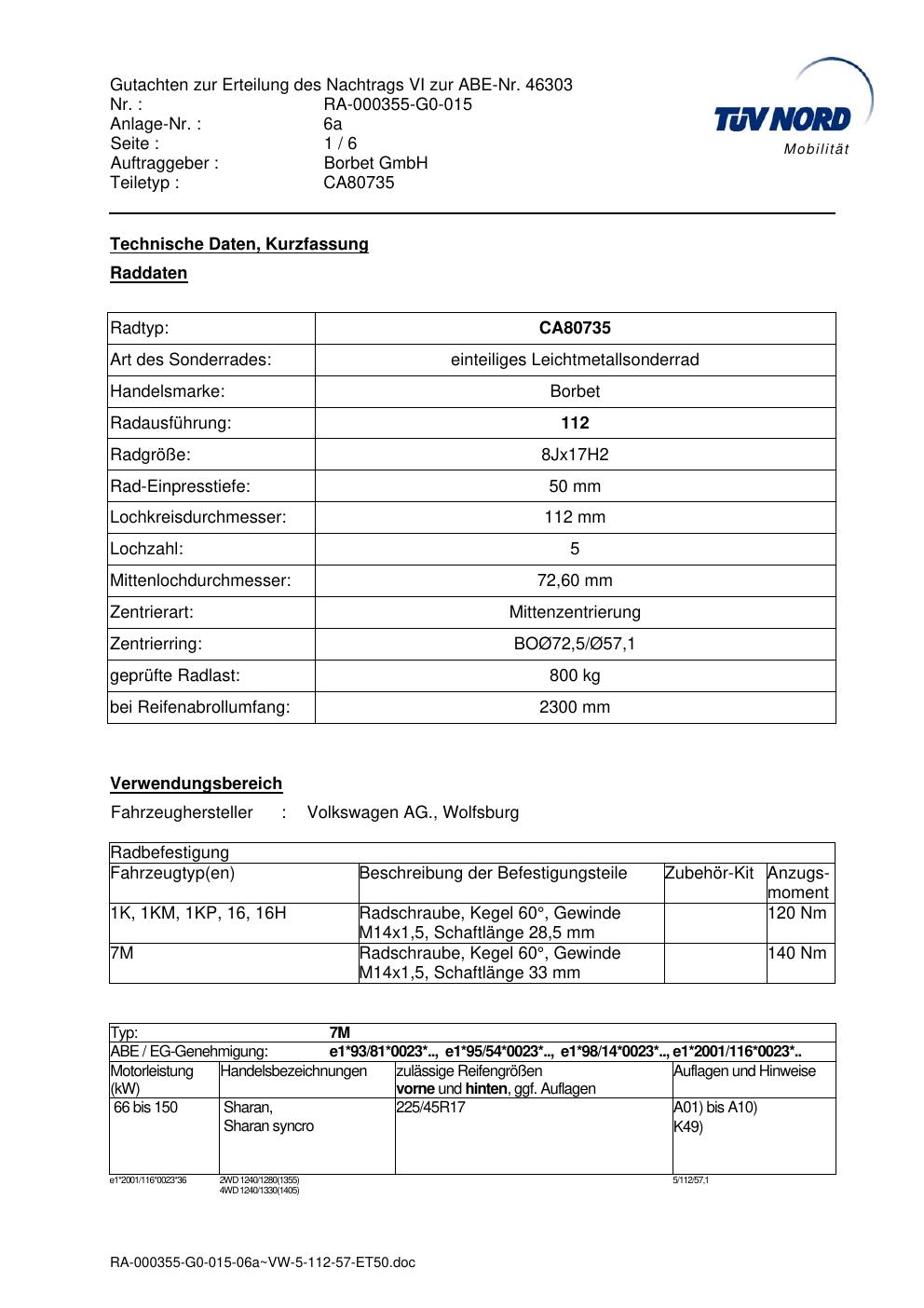 Dieses Gutachten (abe) bezieht sich auf die Alufelge brand-borbet CA80735 in der Ausführung 8Jx17 ET 0, Mittenloch 0 mm (KBA 46303). Im PDF findest du typischerweise zulässige Reifengrößen, Auflagen/Anbauhinweise und – je nach Dokument – Hinweise zur Eintragung.