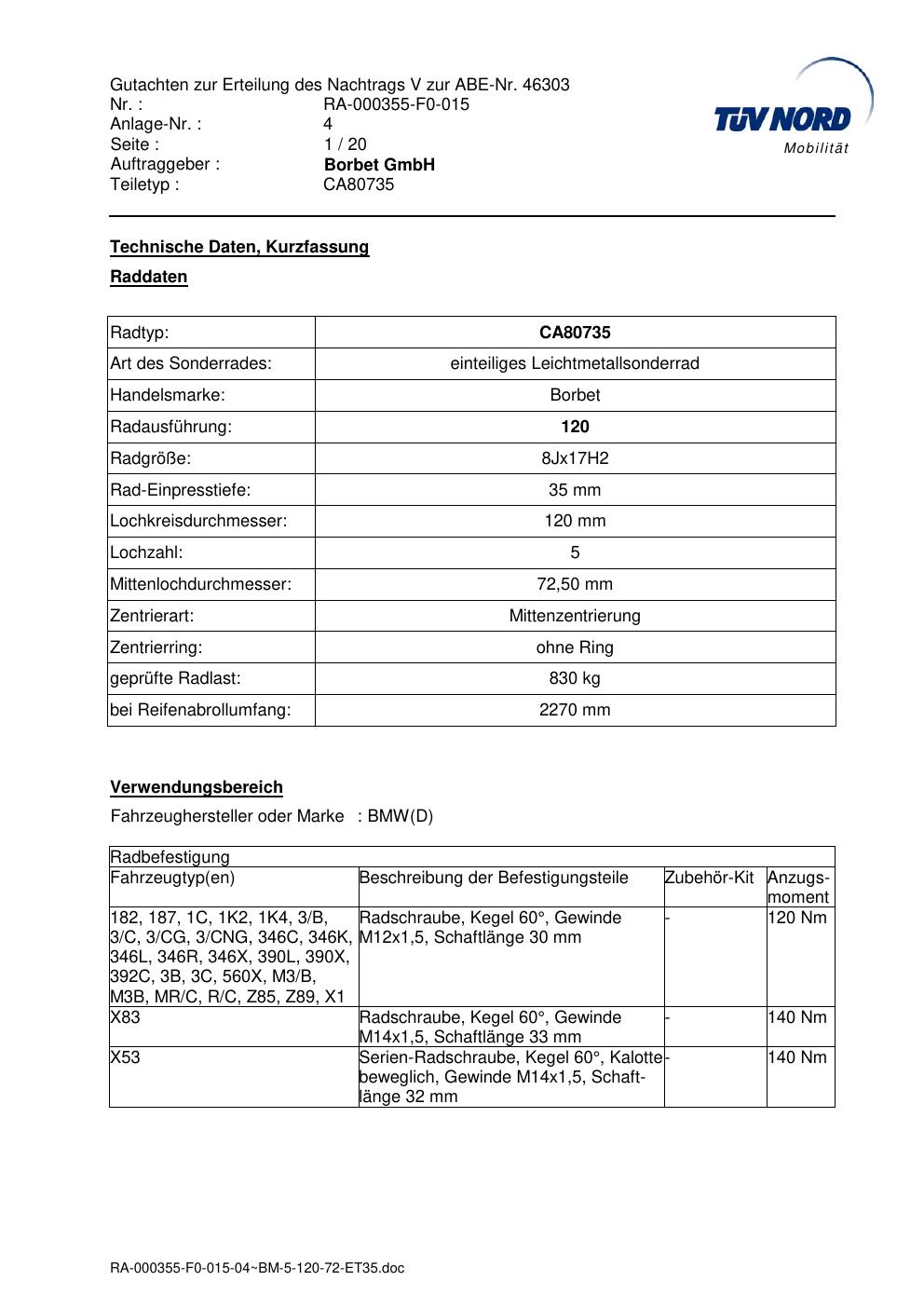 Dieses Gutachten (abe) bezieht sich auf die Alufelge brand-borbet CA80735 in der Ausführung 8Jx17 ET 0, Mittenloch 0 mm (KBA 46303). Im PDF findest du typischerweise zulässige Reifengrößen, Auflagen/Anbauhinweise und – je nach Dokument – Hinweise zur Eintragung.