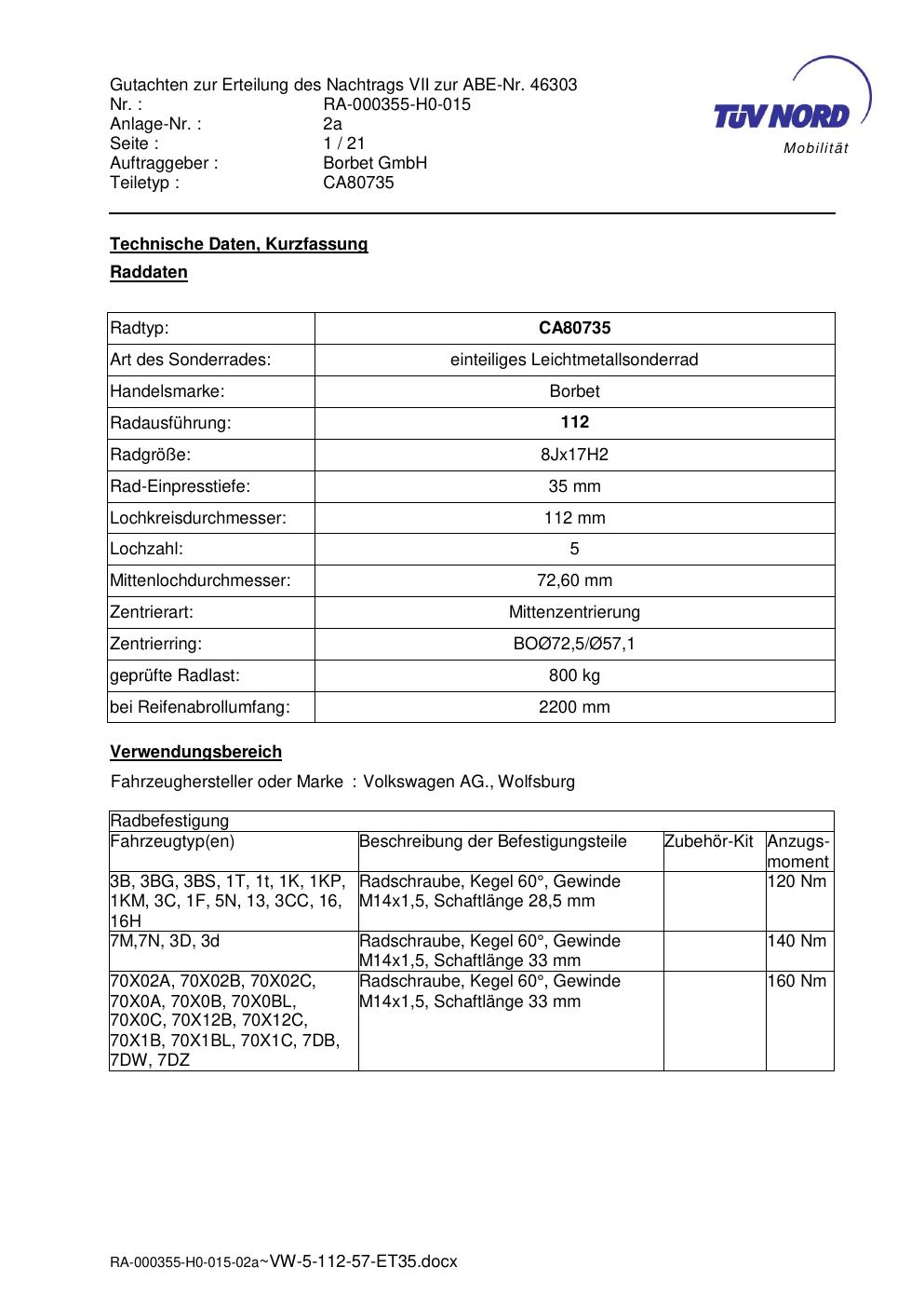 Dieses Gutachten (abe) bezieht sich auf die Alufelge brand-borbet CA80735 in der Ausführung 8Jx17 ET 0, Mittenloch 0 mm (KBA 46303). Im PDF findest du typischerweise zulässige Reifengrößen, Auflagen/Anbauhinweise und – je nach Dokument – Hinweise zur Eintragung.