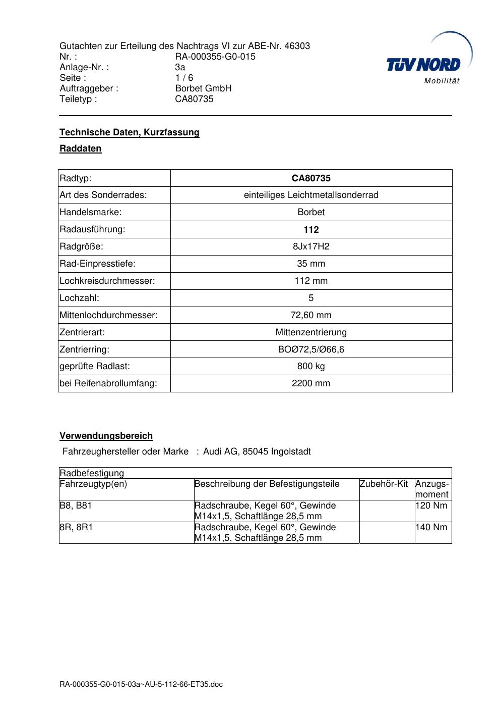 Dieses Gutachten (abe) bezieht sich auf die Alufelge brand-borbet CA80735 in der Ausführung 8Jx17 ET 0, Mittenloch 0 mm (KBA 46303). Im PDF findest du typischerweise zulässige Reifengrößen, Auflagen/Anbauhinweise und – je nach Dokument – Hinweise zur Eintragung.