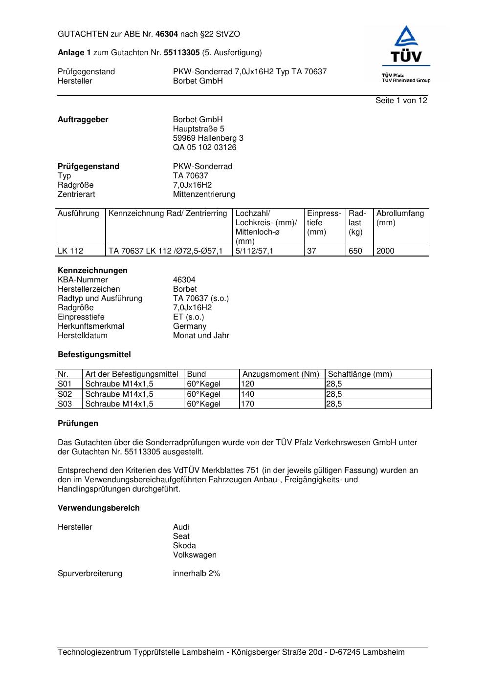 Dieses Gutachten (abe) bezieht sich auf die Alufelge Borbet TA 70637 in der Ausführung 7Jx16 ET 0, Mittenloch 0 mm (KBA 46304). Im PDF findest du typischerweise zulässige Reifengrößen, Auflagen/Anbauhinweise und – je nach Dokument – Hinweise zur Eintragung.