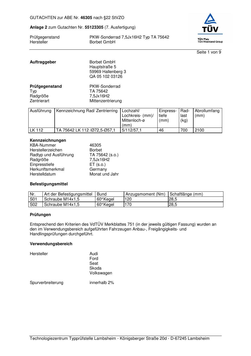 Dieses Gutachten (abe) bezieht sich auf die Alufelge Borbet TA 75642 in der Ausführung 7.5Jx16 ET 0, Mittenloch 0 mm (KBA 46305). Im PDF findest du typischerweise zulässige Reifengrößen, Auflagen/Anbauhinweise und – je nach Dokument – Hinweise zur Eintragung.