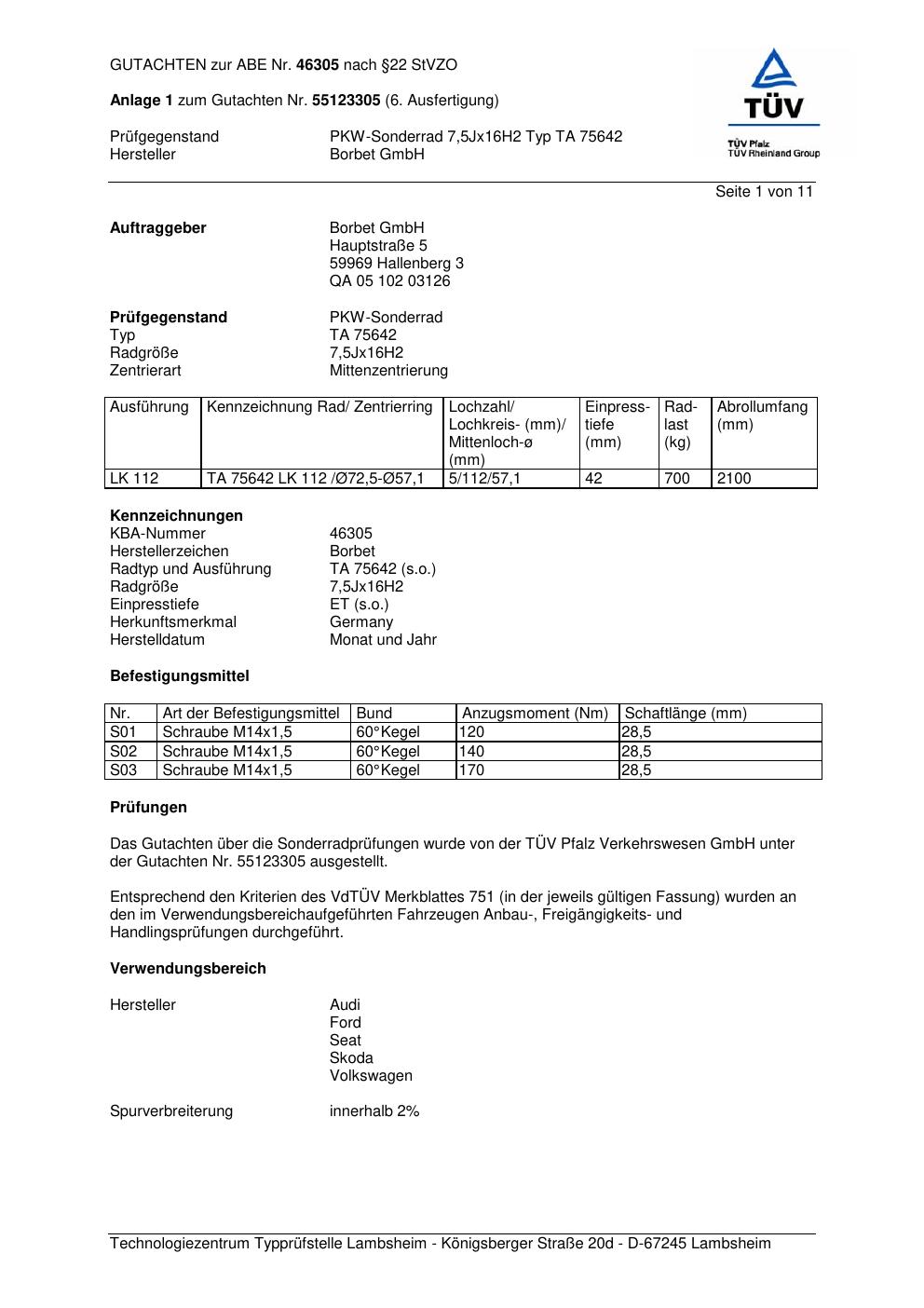 Dieses Gutachten (abe) bezieht sich auf die Alufelge Borbet TA 75642 in der Ausführung 7.5Jx16 ET 0, Mittenloch 0 mm (KBA 46305). Im PDF findest du typischerweise zulässige Reifengrößen, Auflagen/Anbauhinweise und – je nach Dokument – Hinweise zur Eintragung.