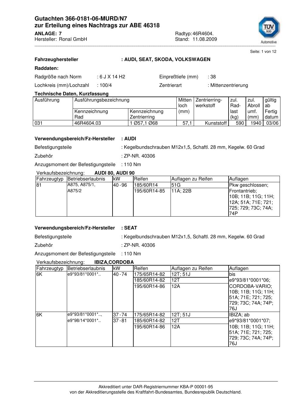 Dieses Gutachten (abe) bezieht sich auf die Alufelge Ronal 46R4604 in der Ausführung 6Jx14 ET 0, Mittenloch 0 mm (KBA 46318). Im PDF findest du typischerweise zulässige Reifengrößen, Auflagen/Anbauhinweise und – je nach Dokument – Hinweise zur Eintragung.