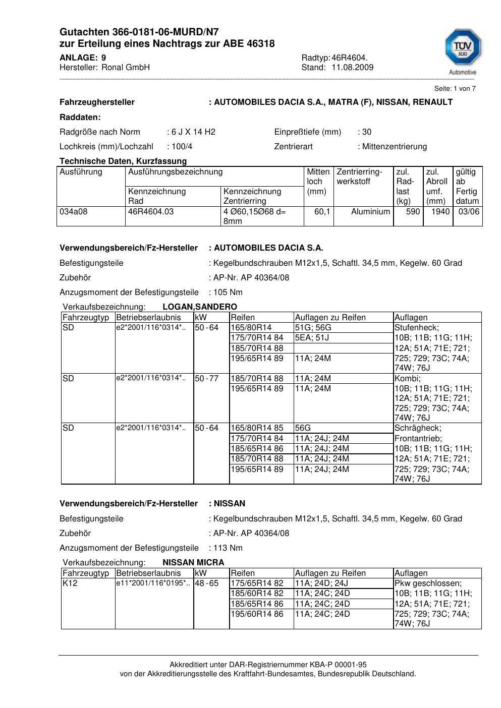 Dieses Gutachten (abe) bezieht sich auf die Alufelge Ronal 46R4604 in der Ausführung 6Jx14 ET 0, Mittenloch 0 mm (KBA 46318). Im PDF findest du typischerweise zulässige Reifengrößen, Auflagen/Anbauhinweise und – je nach Dokument – Hinweise zur Eintragung.