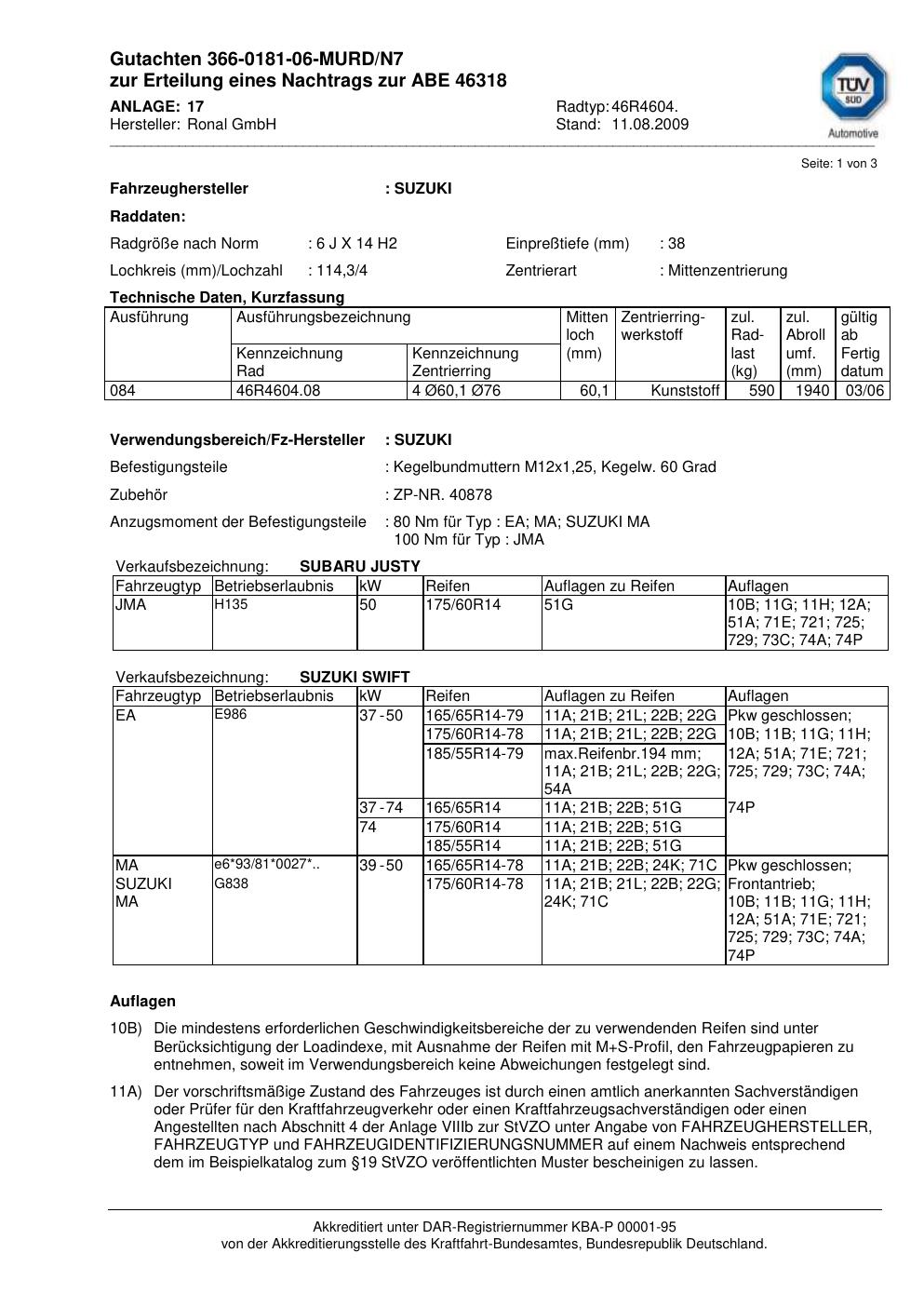 Dieses Gutachten (abe) bezieht sich auf die Alufelge Ronal 46R4604 in der Ausführung 6Jx14 ET 0, Mittenloch 0 mm (KBA 46318). Im PDF findest du typischerweise zulässige Reifengrößen, Auflagen/Anbauhinweise und – je nach Dokument – Hinweise zur Eintragung.