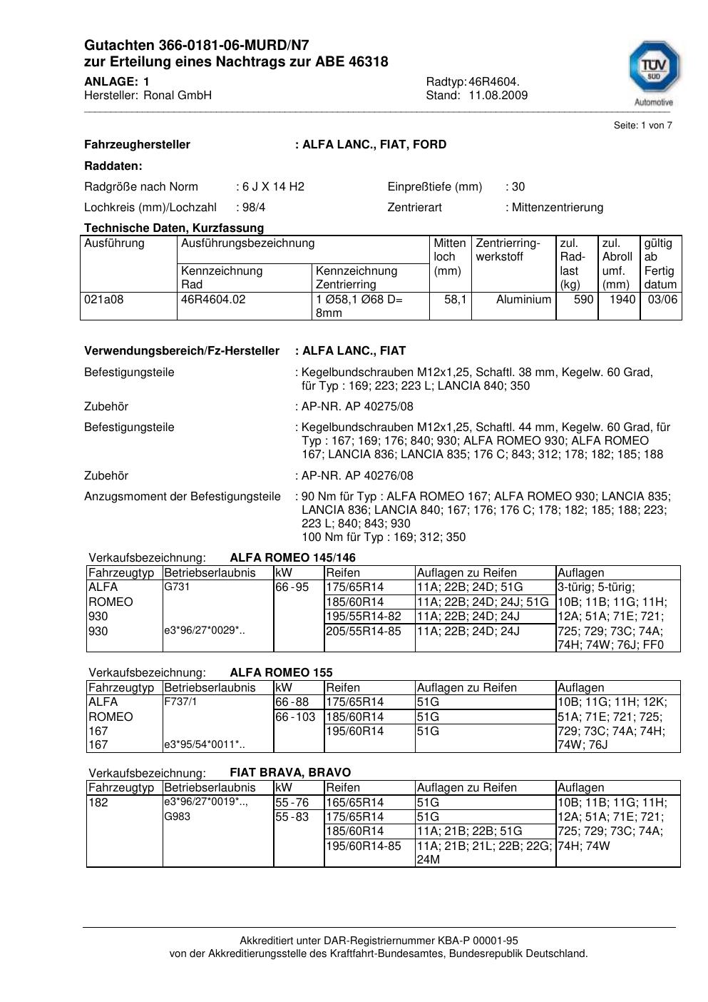 Dieses Gutachten (abe) bezieht sich auf die Alufelge Ronal 46R4604 in der Ausführung 6Jx14 ET 0, Mittenloch 0 mm (KBA 46318). Im PDF findest du typischerweise zulässige Reifengrößen, Auflagen/Anbauhinweise und – je nach Dokument – Hinweise zur Eintragung.
