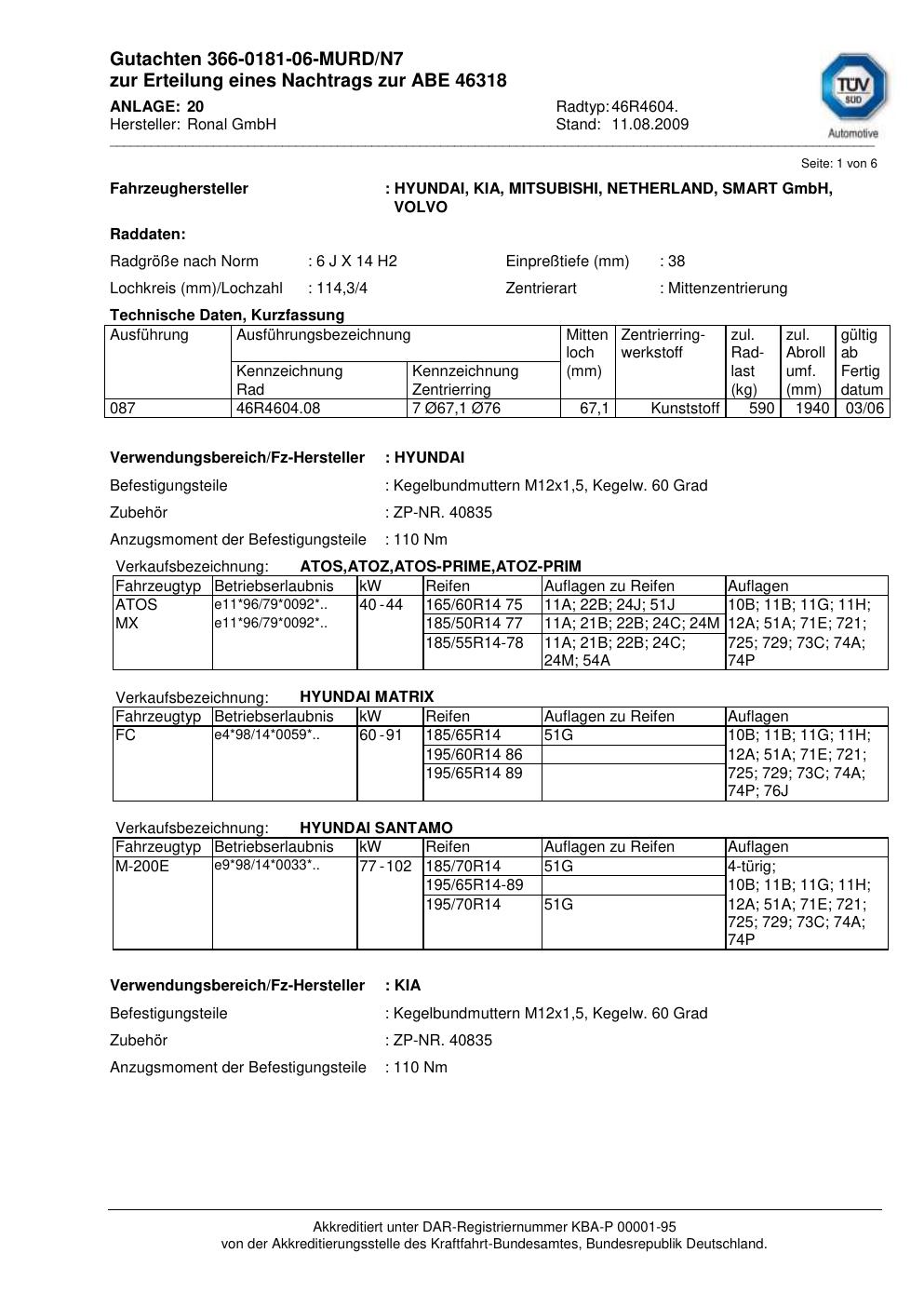 Dieses Gutachten (abe) bezieht sich auf die Alufelge Ronal 46R4604 in der Ausführung 6Jx14 ET 0, Mittenloch 0 mm (KBA 46318). Im PDF findest du typischerweise zulässige Reifengrößen, Auflagen/Anbauhinweise und – je nach Dokument – Hinweise zur Eintragung.