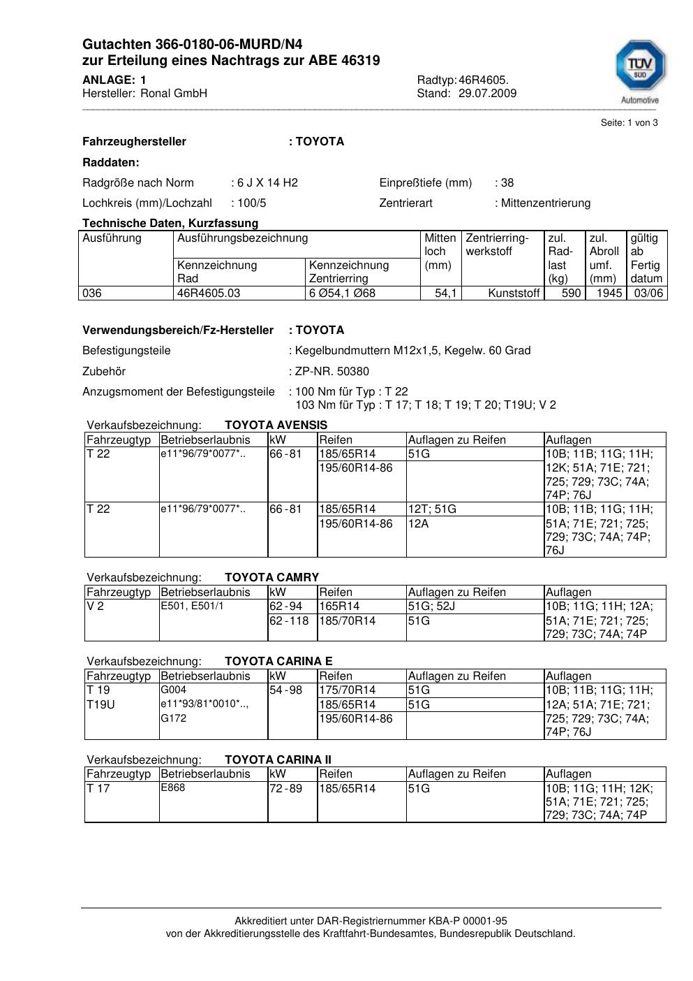 Dieses Gutachten (abe) bezieht sich auf die Alufelge Ronal 46R4605 in der Ausführung 6Jx14 ET 0, Mittenloch 0 mm (KBA 46319). Im PDF findest du typischerweise zulässige Reifengrößen, Auflagen/Anbauhinweise und – je nach Dokument – Hinweise zur Eintragung.