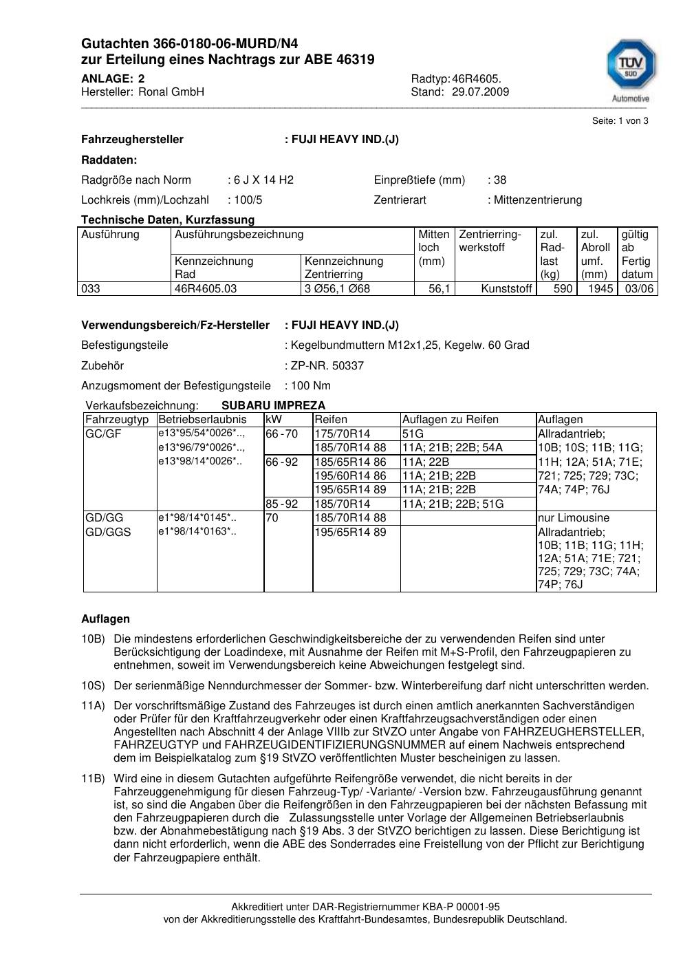 Dieses Gutachten (abe) bezieht sich auf die Alufelge Ronal 46R4605 in der Ausführung 6Jx14 ET 0, Mittenloch 0 mm (KBA 46319). Im PDF findest du typischerweise zulässige Reifengrößen, Auflagen/Anbauhinweise und – je nach Dokument – Hinweise zur Eintragung.