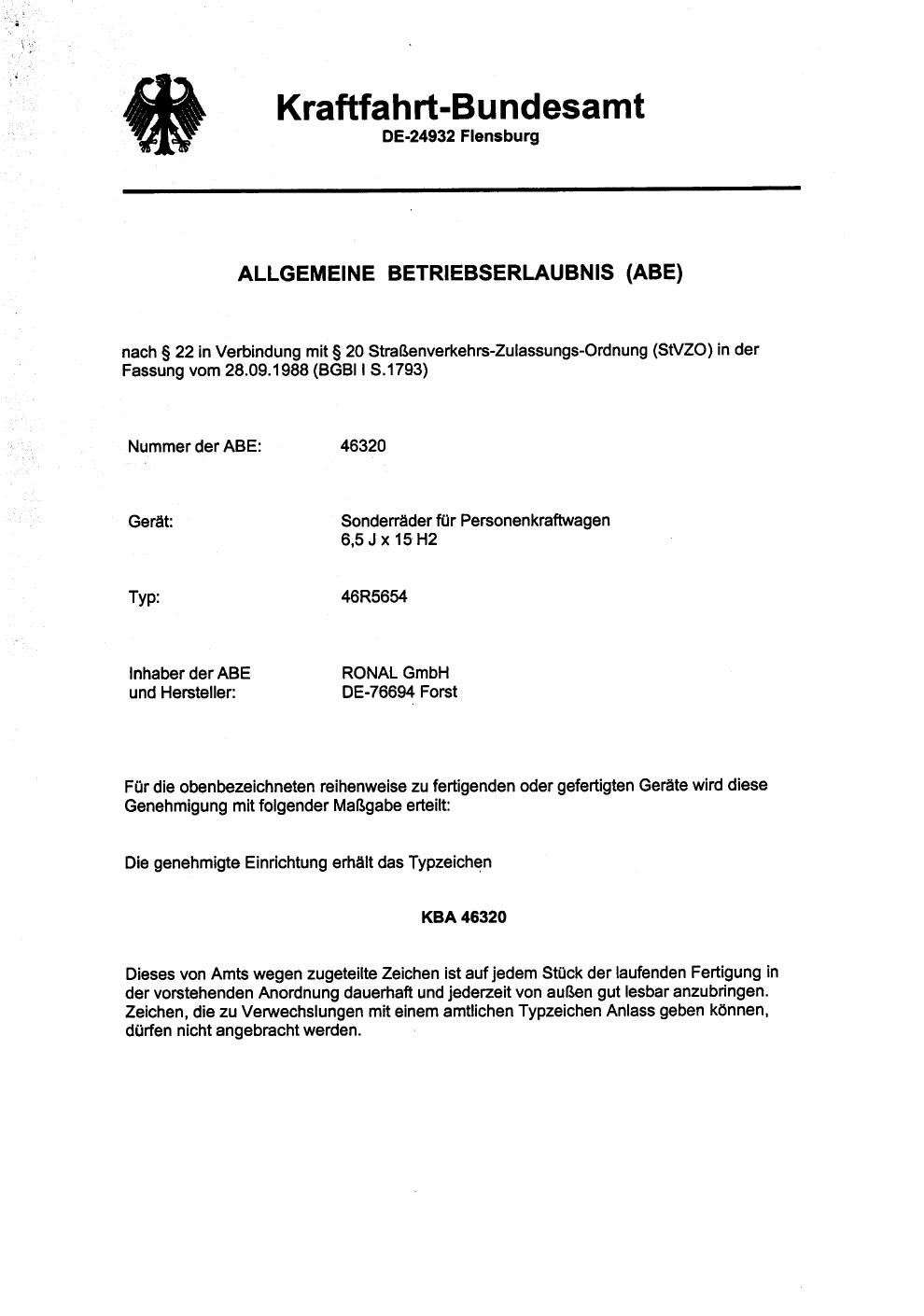 Dieses Gutachten (abe) bezieht sich auf die Alufelge ATS 46R5654 in der Ausführung 2Jx15 ET 0, Mittenloch 0 mm (KBA 46320). Im PDF findest du typischerweise zulässige Reifengrößen, Auflagen/Anbauhinweise und – je nach Dokument – Hinweise zur Eintragung.