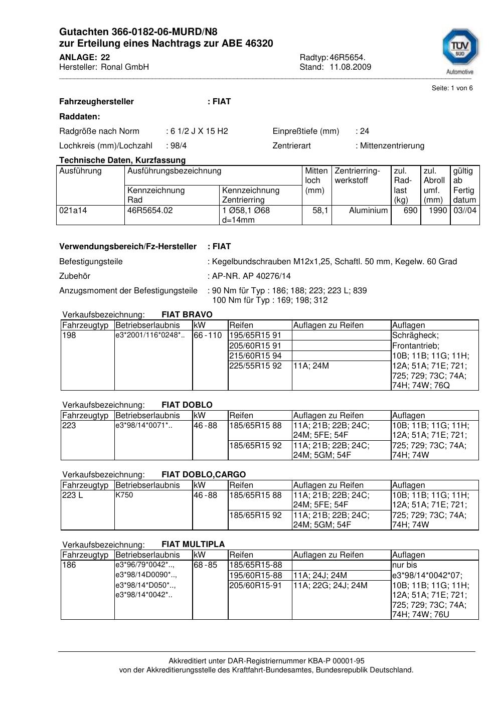 Felgengutachten / abe für Alufelgen Ronal 46R5654 (2Jx15 ET 0, Mittenloch 0 mm) mit KBA 46320 (Zertifikatsnummer 46320). Hier kostenlos als PDF herunterladen. Der Download-Link ist 24 Stunden gültig und kann bis zu zwei Mal verwendet werden.