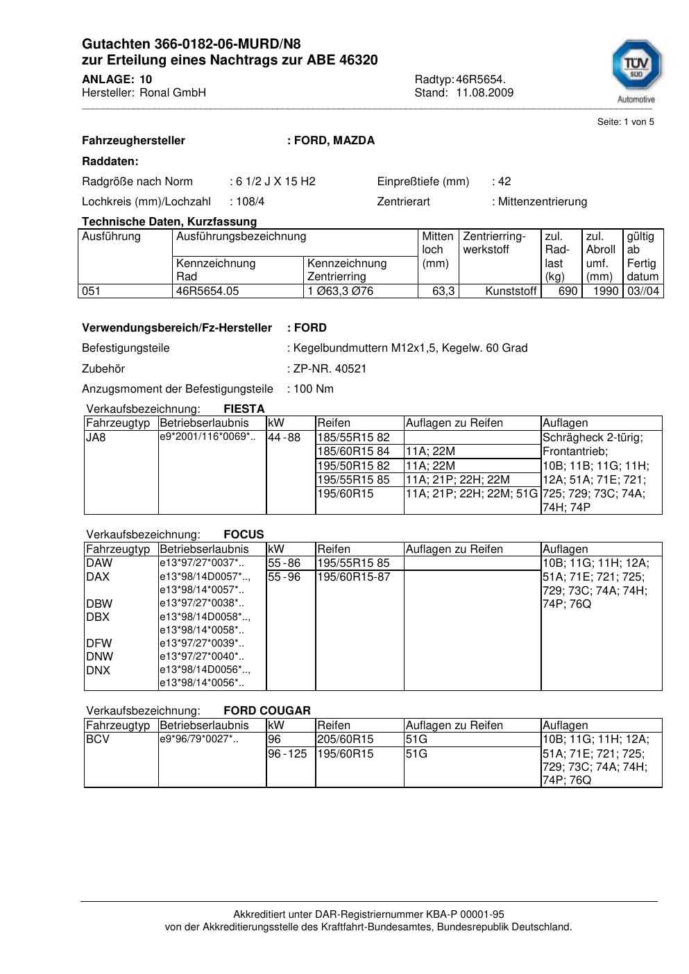 Felgengutachten / abe für Alufelgen Ronal 46R5654 (2Jx15 ET 0, Mittenloch 0 mm) mit KBA 46320 (Zertifikatsnummer 46320). Hier kostenlos als PDF herunterladen. Der Download-Link ist 24 Stunden gültig und kann bis zu zwei Mal verwendet werden.