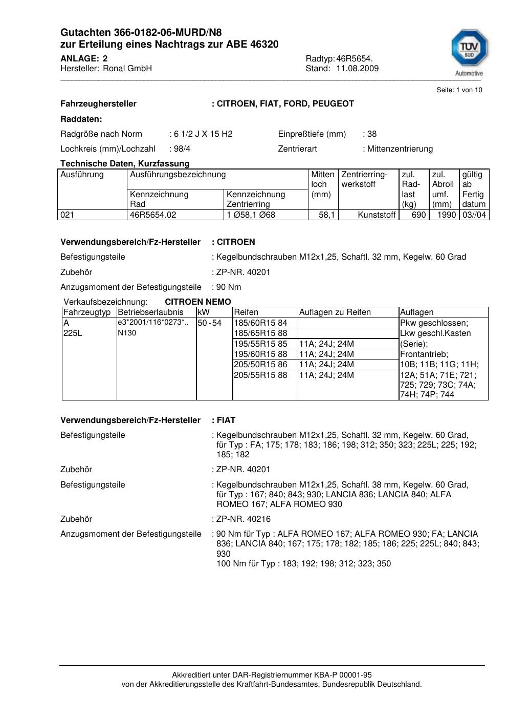 Felgengutachten / abe für Alufelgen Ronal 46R5654 (2Jx15 ET 0, Mittenloch 0 mm) mit KBA 46320 (Zertifikatsnummer 46320). Hier kostenlos als PDF herunterladen. Der Download-Link ist 24 Stunden gültig und kann bis zu zwei Mal verwendet werden.