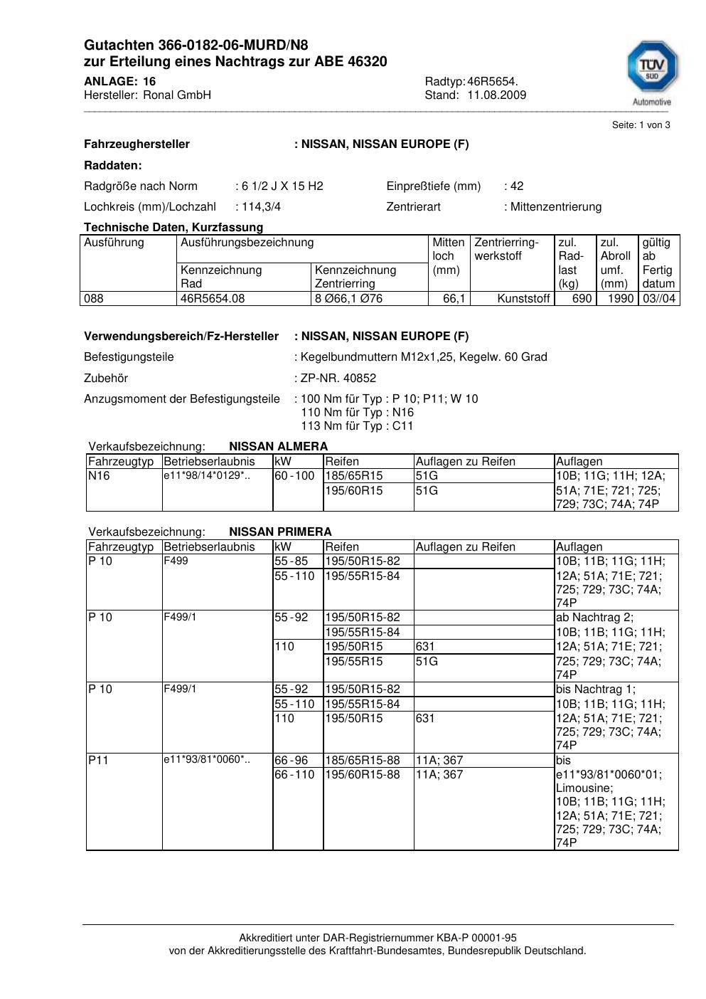 Dieses Gutachten (abe) bezieht sich auf die Alufelge Ronal 46R5654 in der Ausführung 2Jx15 ET 0, Mittenloch 0 mm (KBA 46320). Im PDF findest du typischerweise zulässige Reifengrößen, Auflagen/Anbauhinweise und – je nach Dokument – Hinweise zur Eintragung.