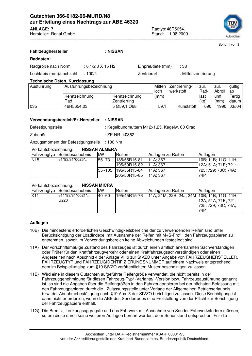 Dieses Gutachten (abe) bezieht sich auf die Alufelge Ronal 46R5654 in der Ausführung 2Jx15 ET 0, Mittenloch 0 mm (KBA 46320). Im PDF findest du typischerweise zulässige Reifengrößen, Auflagen/Anbauhinweise und – je nach Dokument – Hinweise zur Eintragung.