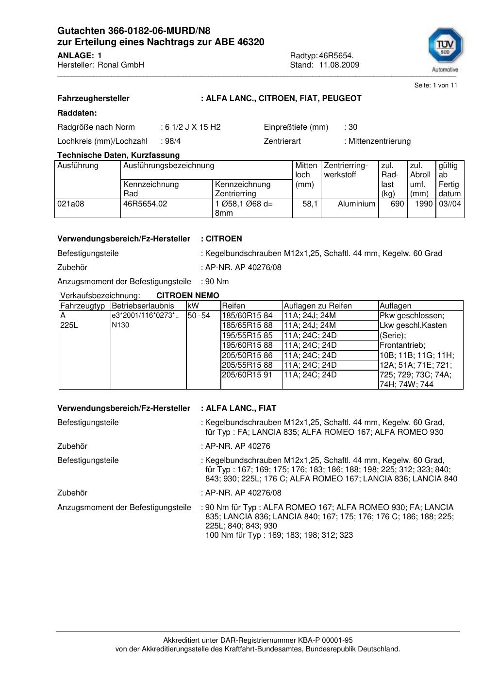 Dieses Gutachten (abe) bezieht sich auf die Alufelge Ronal 46R5654 in der Ausführung 2Jx15 ET 0, Mittenloch 0 mm (KBA 46320). Im PDF findest du typischerweise zulässige Reifengrößen, Auflagen/Anbauhinweise und – je nach Dokument – Hinweise zur Eintragung.