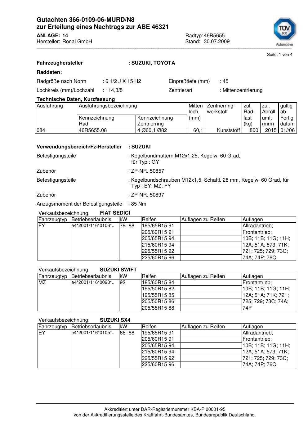 Dieses Gutachten (abe) bezieht sich auf die Alufelge Ronal 46R5655 in der Ausführung 2Jx15 ET 0, Mittenloch 0 mm (KBA 46321). Im PDF findest du typischerweise zulässige Reifengrößen, Auflagen/Anbauhinweise und – je nach Dokument – Hinweise zur Eintragung.