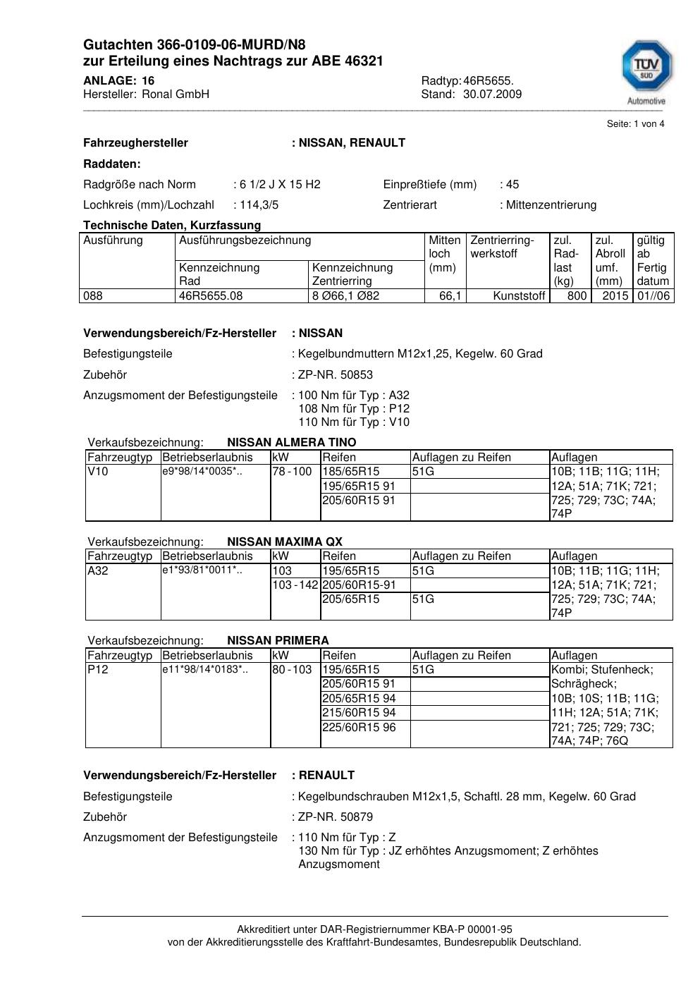 Dieses Gutachten (abe) bezieht sich auf die Alufelge Ronal 46R5655 in der Ausführung 2Jx15 ET 0, Mittenloch 0 mm (KBA 46321). Im PDF findest du typischerweise zulässige Reifengrößen, Auflagen/Anbauhinweise und – je nach Dokument – Hinweise zur Eintragung.