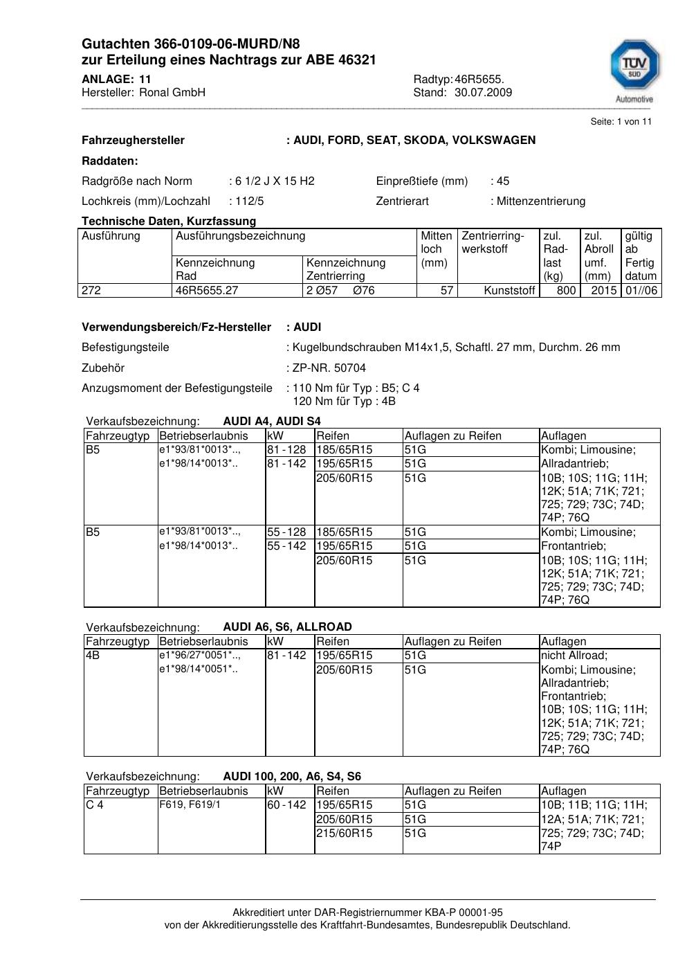 Dieses Gutachten (abe) bezieht sich auf die Alufelge Ronal 46R5655 in der Ausführung 2Jx15 ET 0, Mittenloch 0 mm (KBA 46321). Im PDF findest du typischerweise zulässige Reifengrößen, Auflagen/Anbauhinweise und – je nach Dokument – Hinweise zur Eintragung.