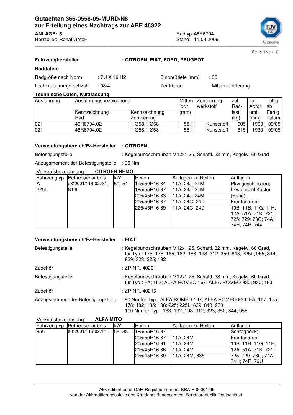 Dieses Gutachten (abe) bezieht sich auf die Alufelge Ronal 46R6704 in der Ausführung 7Jx16 ET 0, Mittenloch 0 mm (KBA 46322). Im PDF findest du typischerweise zulässige Reifengrößen, Auflagen/Anbauhinweise und – je nach Dokument – Hinweise zur Eintragung.