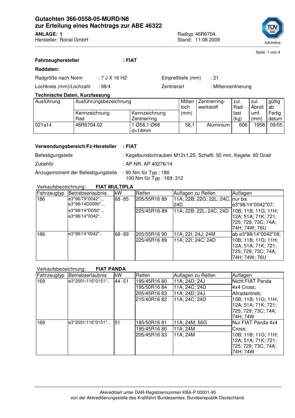 Dieses Gutachten (abe) bezieht sich auf die Alufelge Ronal 46R6704 in der Ausführung 7Jx16 ET 0, Mittenloch 0 mm (KBA 46322). Im PDF findest du typischerweise zulässige Reifengrößen, Auflagen/Anbauhinweise und – je nach Dokument – Hinweise zur Eintragung.