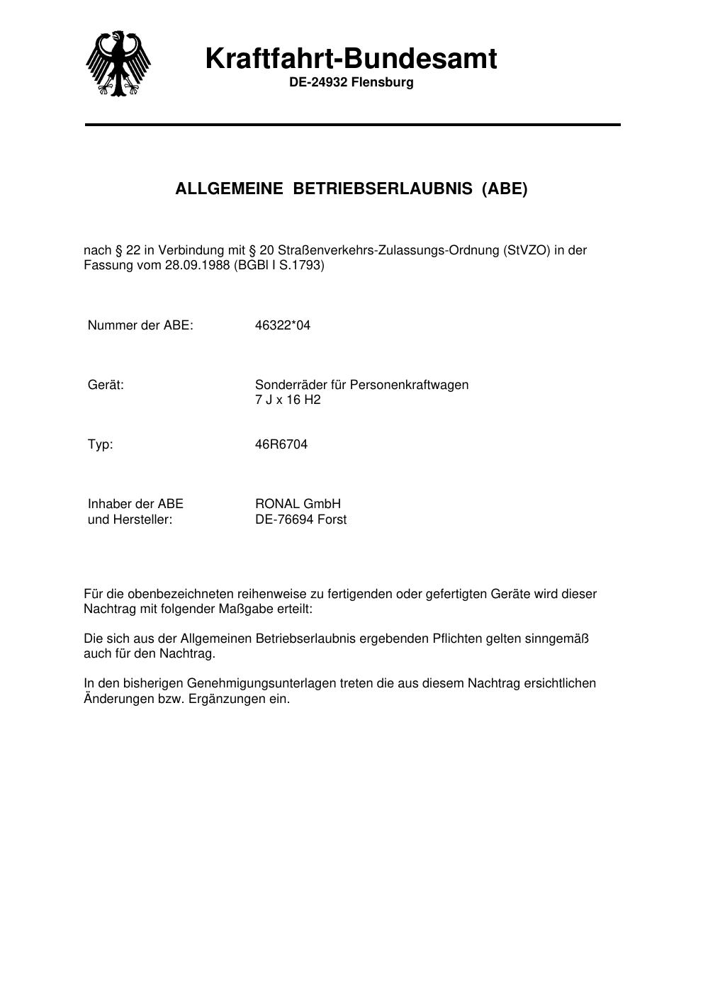 Dieses Gutachten (abe) bezieht sich auf die Alufelge Ronal 46R6704 in der Ausführung 7Jx16 ET 0, Mittenloch 0 mm (KBA 46322). Im PDF findest du typischerweise zulässige Reifengrößen, Auflagen/Anbauhinweise und – je nach Dokument – Hinweise zur Eintragung.