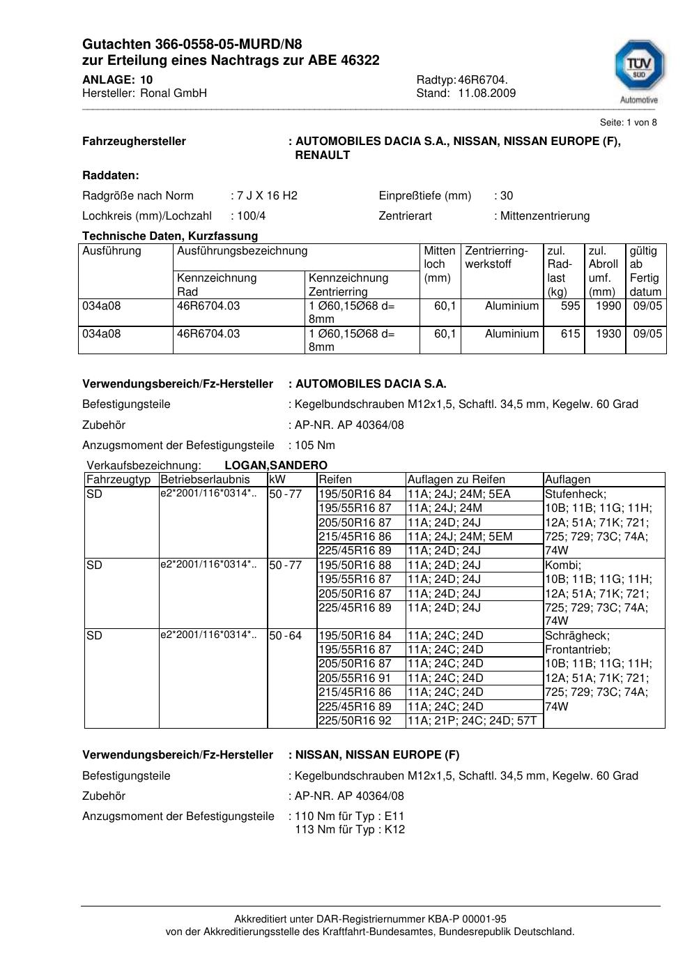 Dieses Gutachten (abe) bezieht sich auf die Alufelge Ronal 46R6704 in der Ausführung 7Jx16 ET 0, Mittenloch 0 mm (KBA 46322). Im PDF findest du typischerweise zulässige Reifengrößen, Auflagen/Anbauhinweise und – je nach Dokument – Hinweise zur Eintragung.