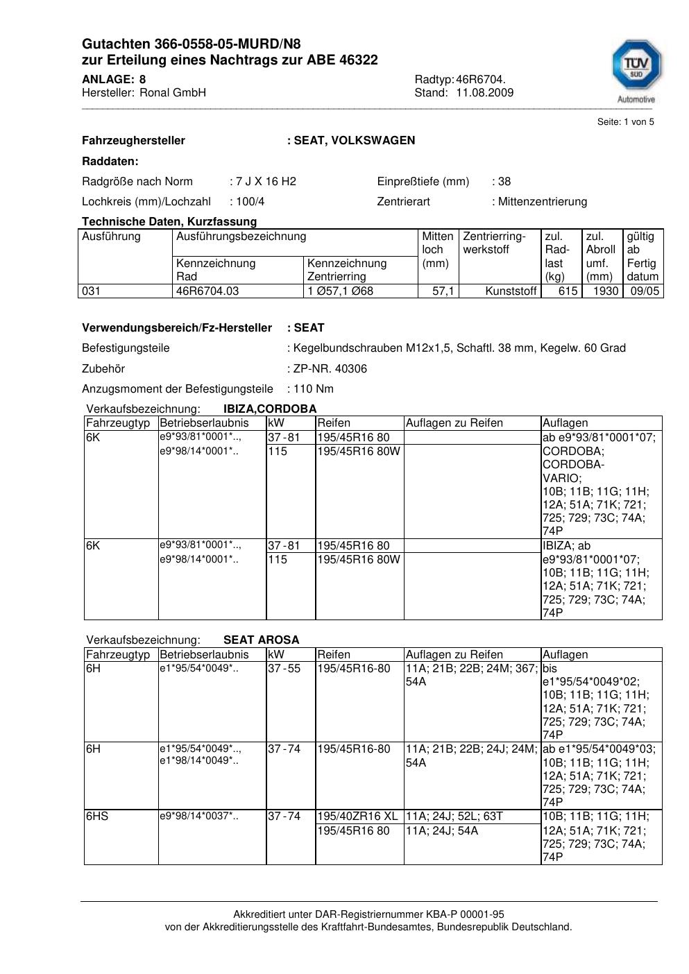 Dieses Gutachten (abe) bezieht sich auf die Alufelge Ronal 46R6704 in der Ausführung 7Jx16 ET 0, Mittenloch 0 mm (KBA 46322). Im PDF findest du typischerweise zulässige Reifengrößen, Auflagen/Anbauhinweise und – je nach Dokument – Hinweise zur Eintragung.